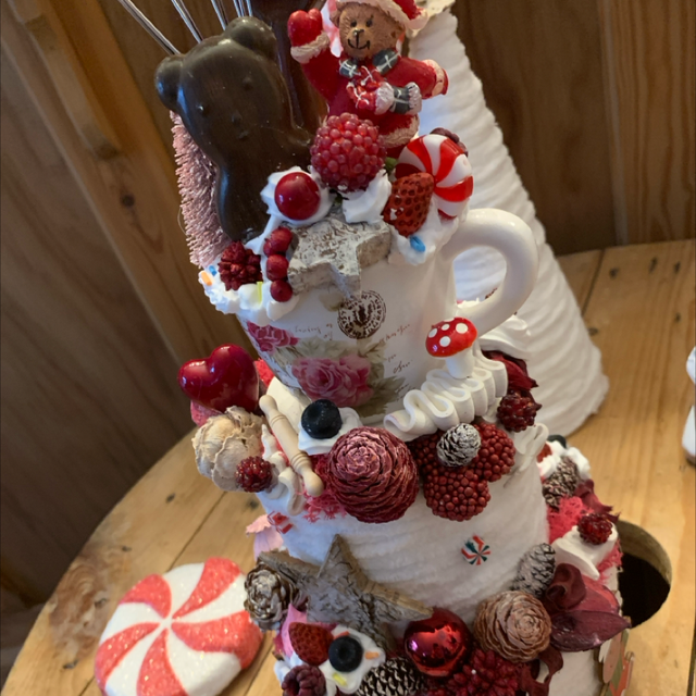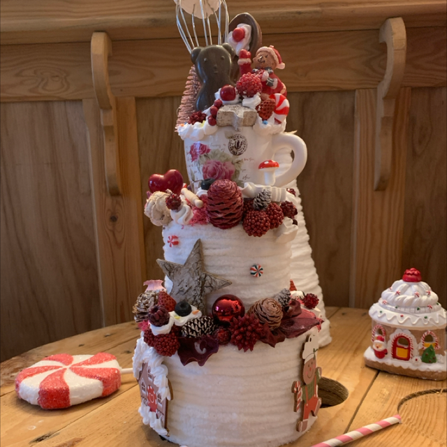 Ce gâteau poétique, entièrement composé de fleurs séchées et de petits décors inspirés de la pâtisserie — rosaces légères, mini gourmandises, touches sucrées et petits oursons — se dresse sur trois étages délicats (environ 38 cm de hauteur, 15 cm de diamètre).