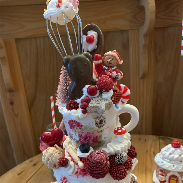 Sur le sommet, une note malicieuse : un petit fouet de cuisine ou une tasse vient parfaire la scène, comme un clin d’œil au monde de la pâtisserie.